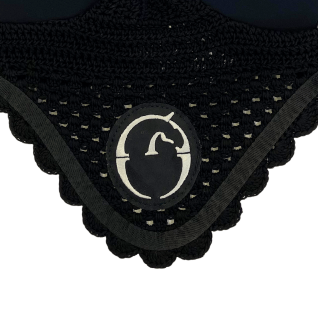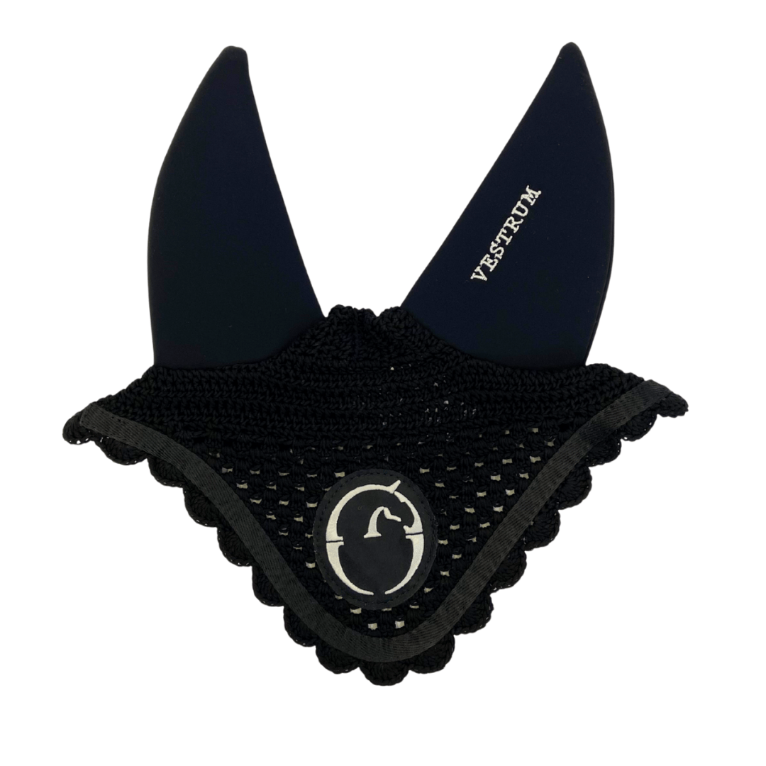 Svart ljuddämpande huva från Vestrum. Virkad i svart bomullsgarn med vadderade, lite stretchiga öron. Ton-i-ton kantband och vit logga samt vit text.