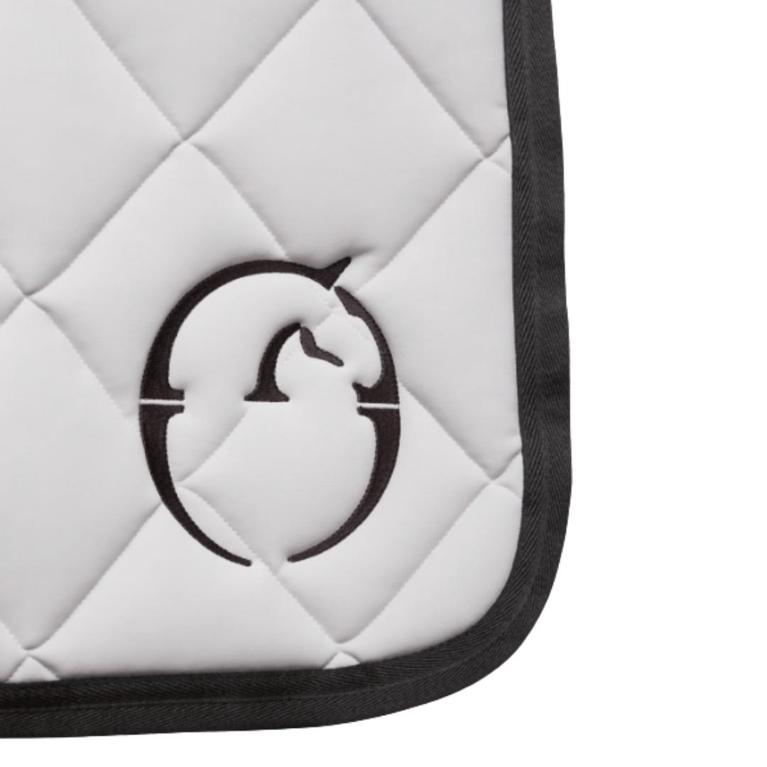 Pärlgrått dressyrschabrak från Vestrum. Vestrum logga broderad i svart på vänster sida av schabraket. Våffelmönstrad undersida som ger ett bra grepp och svettabsorbering. Stilrent schabrak med snedställt rutmönster och dubbla svarta kantband.