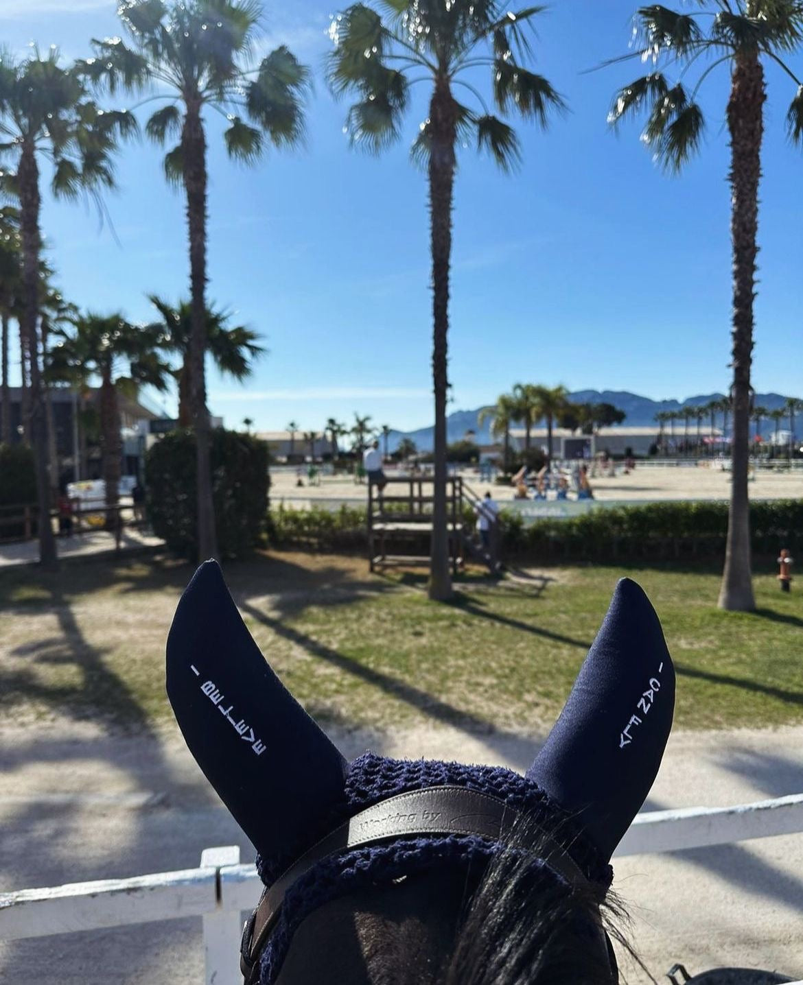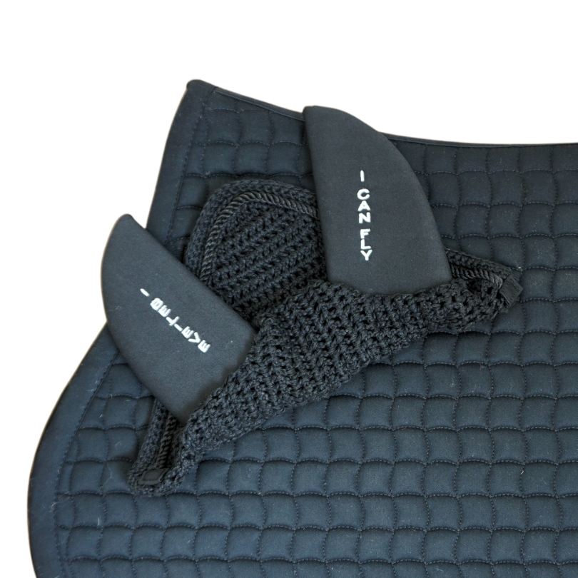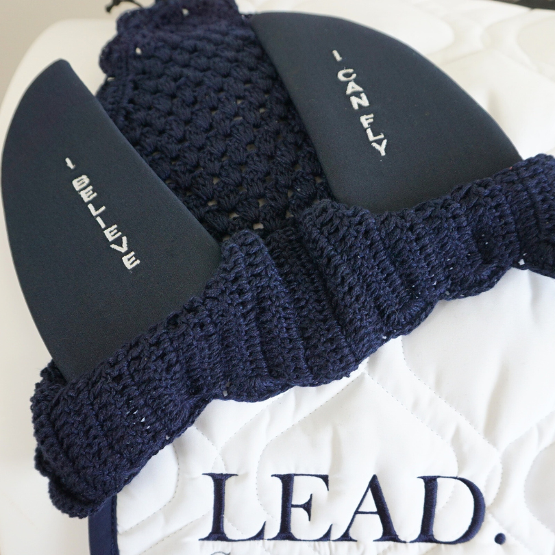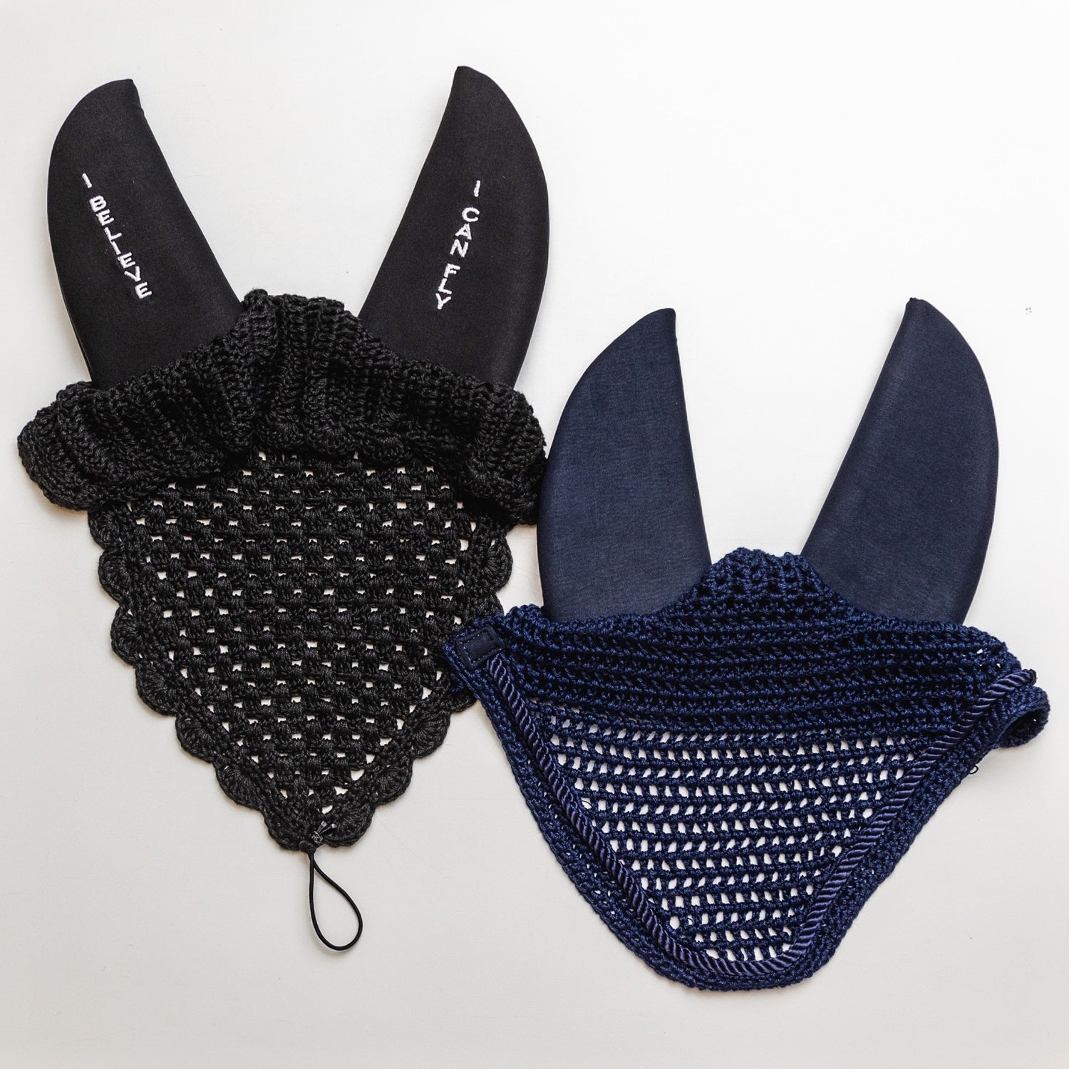 Huvan är virkad i mjukt bomullsgarn. Öronen är i tjock neopren som dämpar ljudet utifrån. Välj mellan svart, stilren och diskret vilket passar alla hästar och outfits eller en vackert marinblå som perfekt kompletterar Vestrums vita schabrak med marinblå kant!