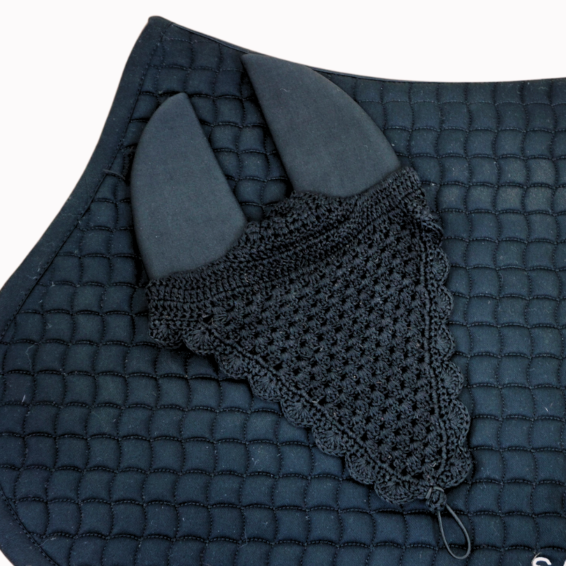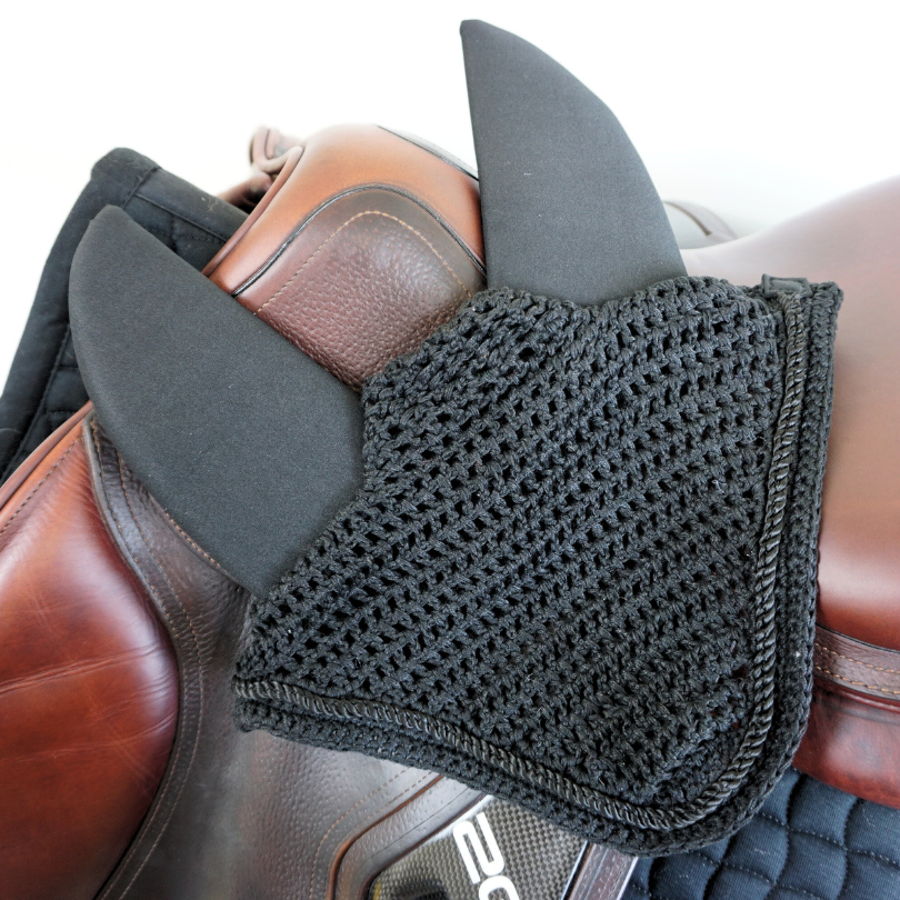 Huvan är virkad i mjukt svart bomullsgarn. Öronen är i tjock neopren som dämpar ljudet utifrån. Svart stilren och diskret huva i övrigt, passar alla hästar och outfits!