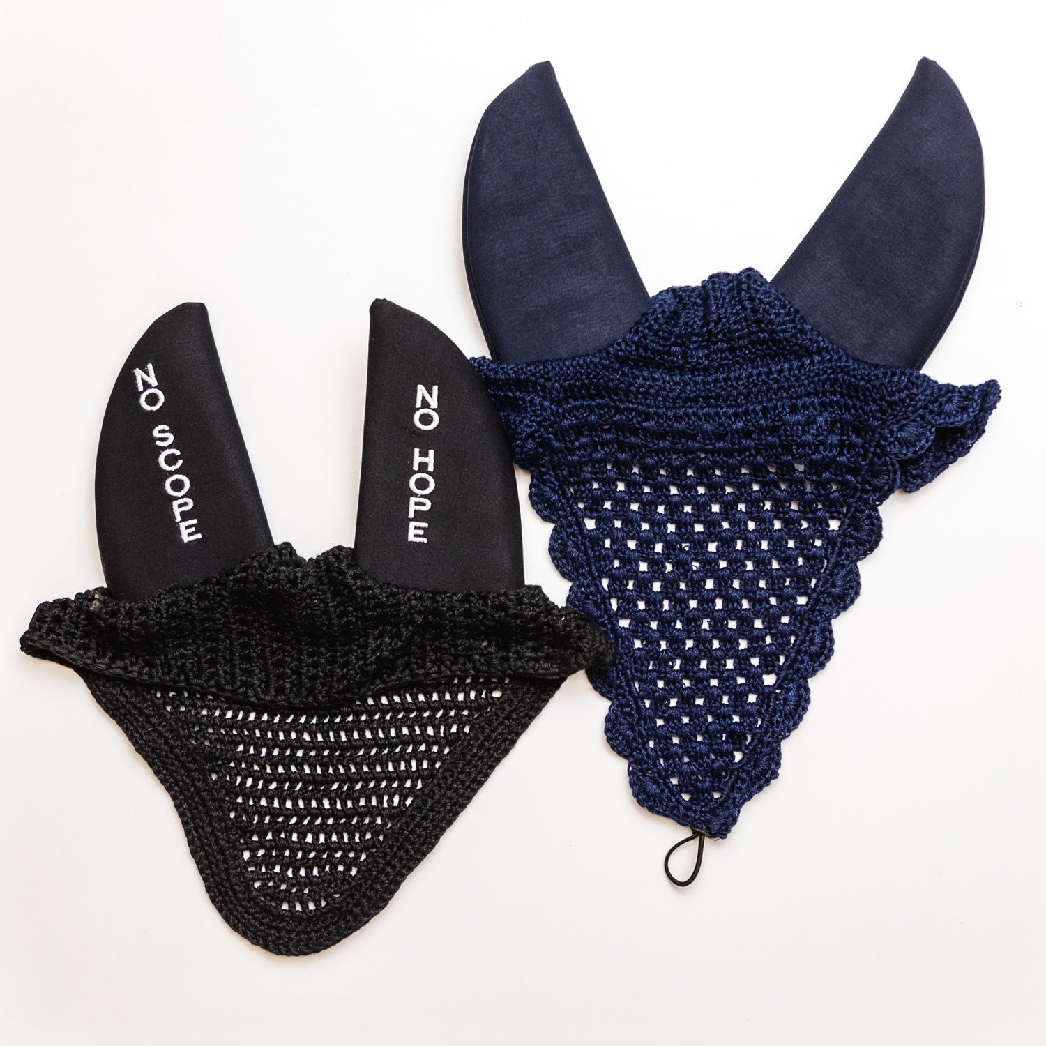 Rolig huva med texten No scope No hope broderat på öronen. Kanske en passande påminnelse till dig med unghäst?!
