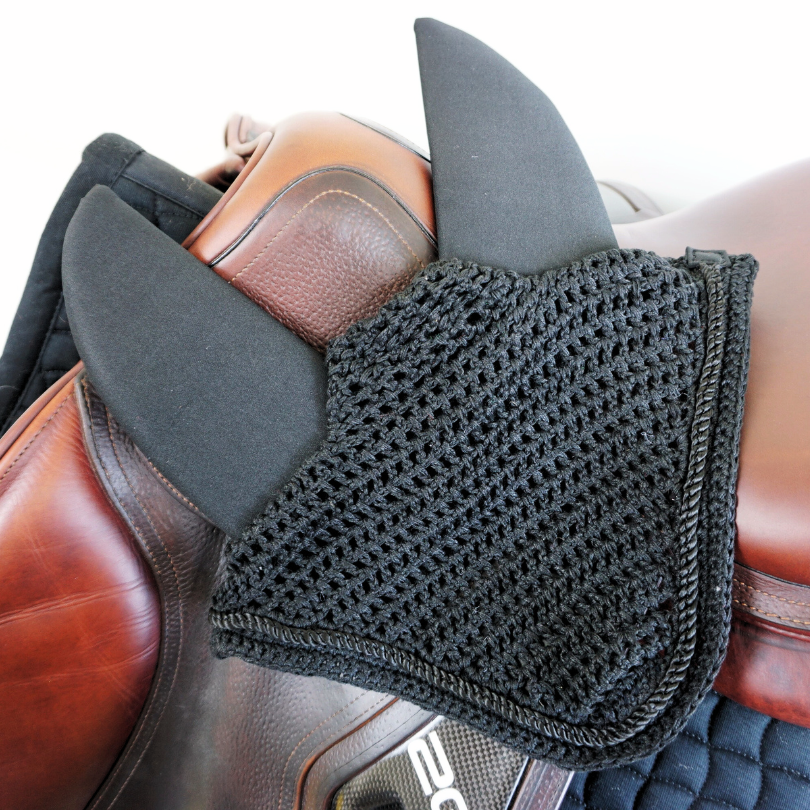 Huvan är virkad i mjukt bomullsgarn. Öronen är i tjock neopren som dämpar ljud utifrån. Diskret svart huva som är lätt att matcha din outfit och passar till hästar i alla olika färger.