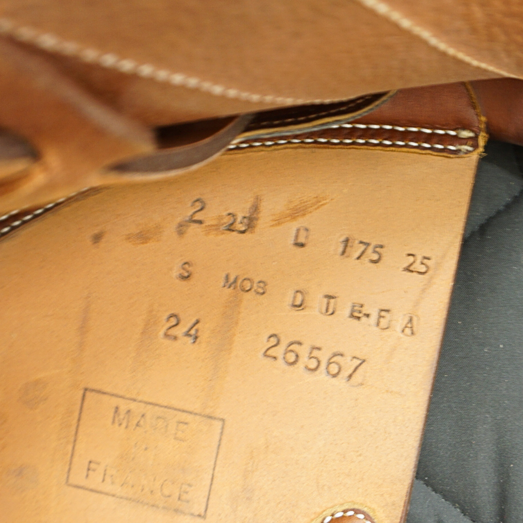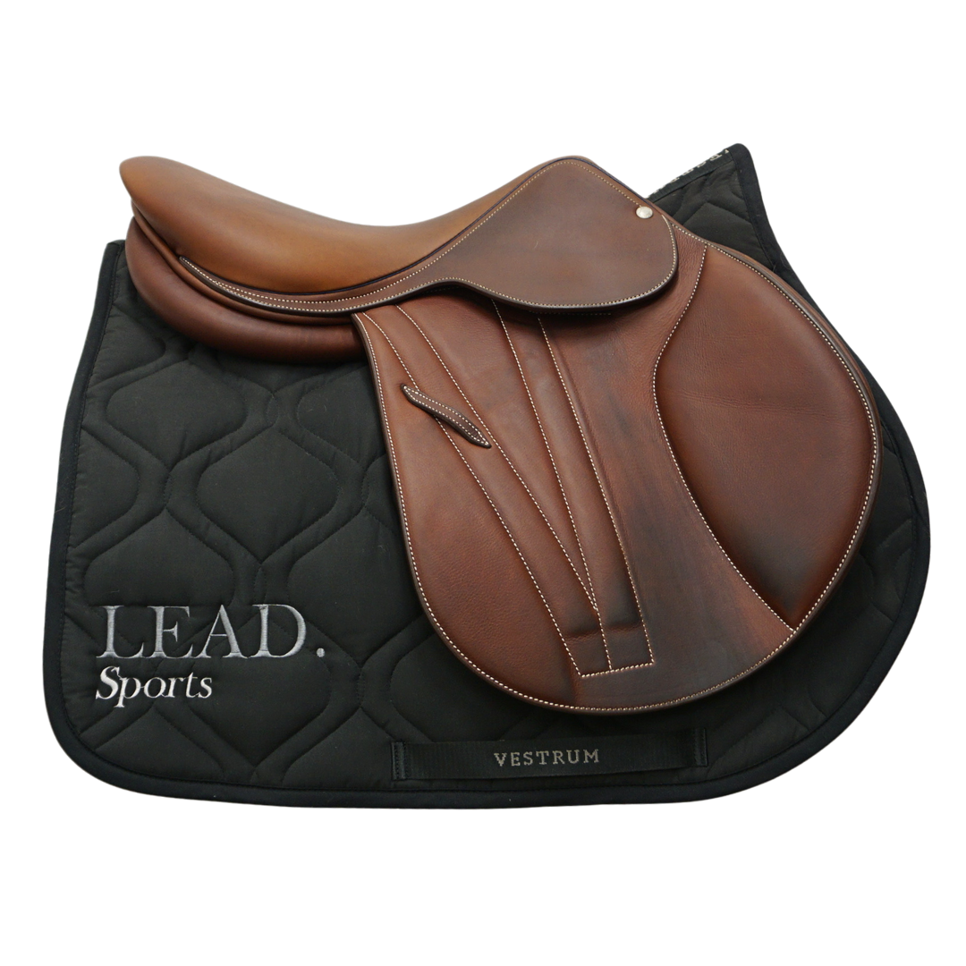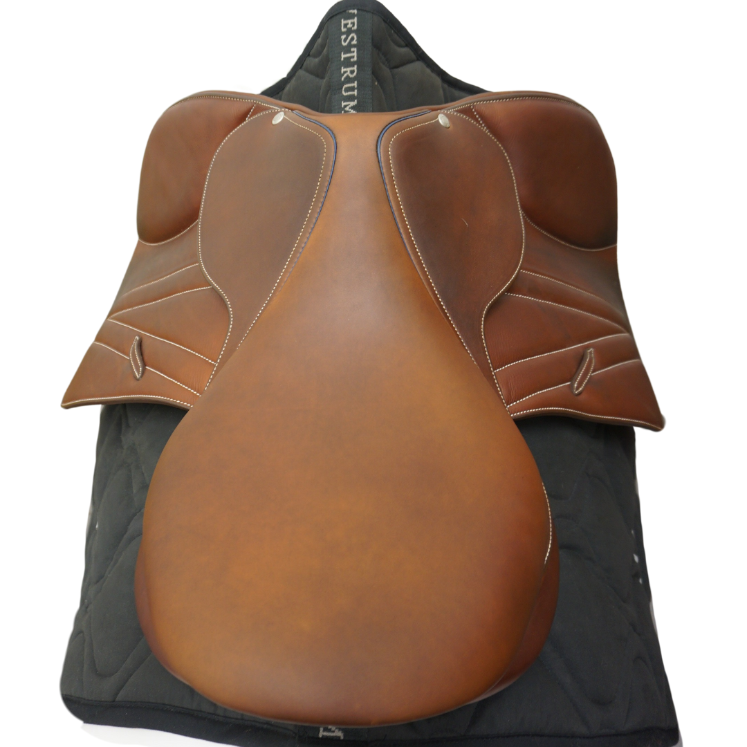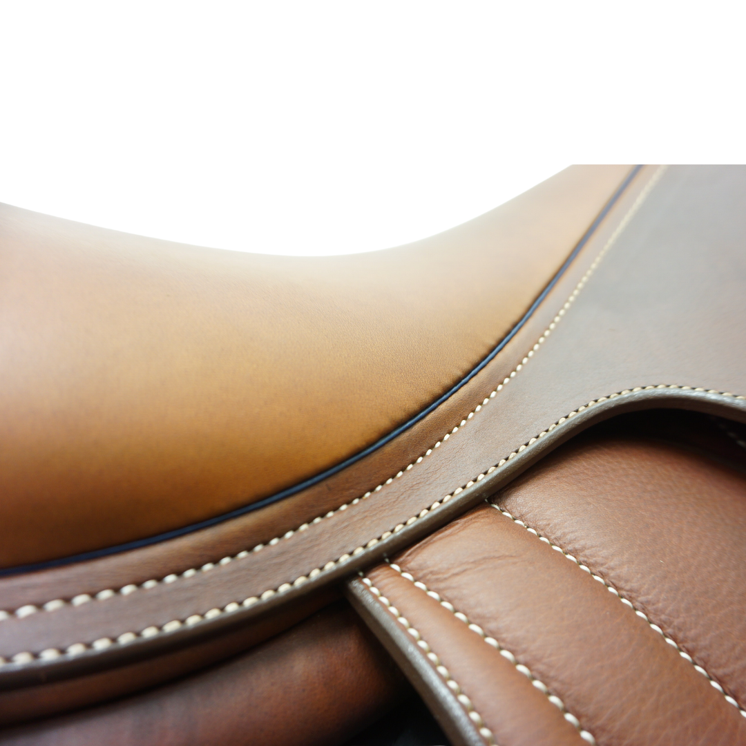 Ny handgjord hoppsadel i dubbelsytt kalvskinn, endast testriden i ett fåtal gånger. Enastående grepp i en annars avskalad och minimal design. Perfekt för dig som söker stöd utan att bli "instängd". Utrustad med klossar under kåpan. Tunn, stilren mörk passpoal längs med sitsen ger sadeln en unik, diskret touch av elegans!