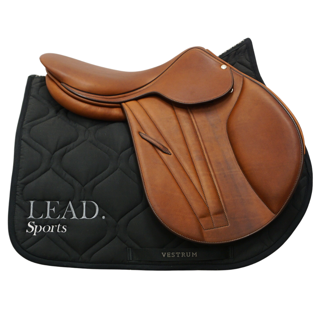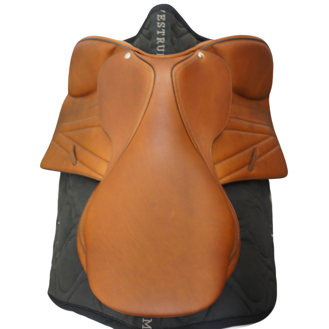 Ny handgjord hoppsadel i dubbelsytt kalvskinn. Enastående grepp i en annars avskalad och minimal design. Perfekt för dig med god egen balans som vill ha en öppen sits. Utrustad med klossar under kåpan.