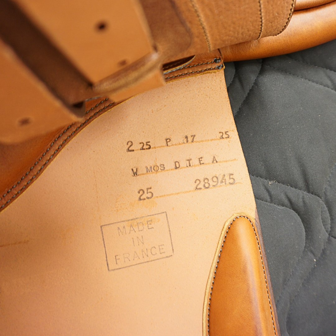 Ny fin Butet-sadel för omgående leverans. Sadeln har helt flat sits och är tillverkad i dubbelsytt kalvskinn i Butets klassiska färg Gold.