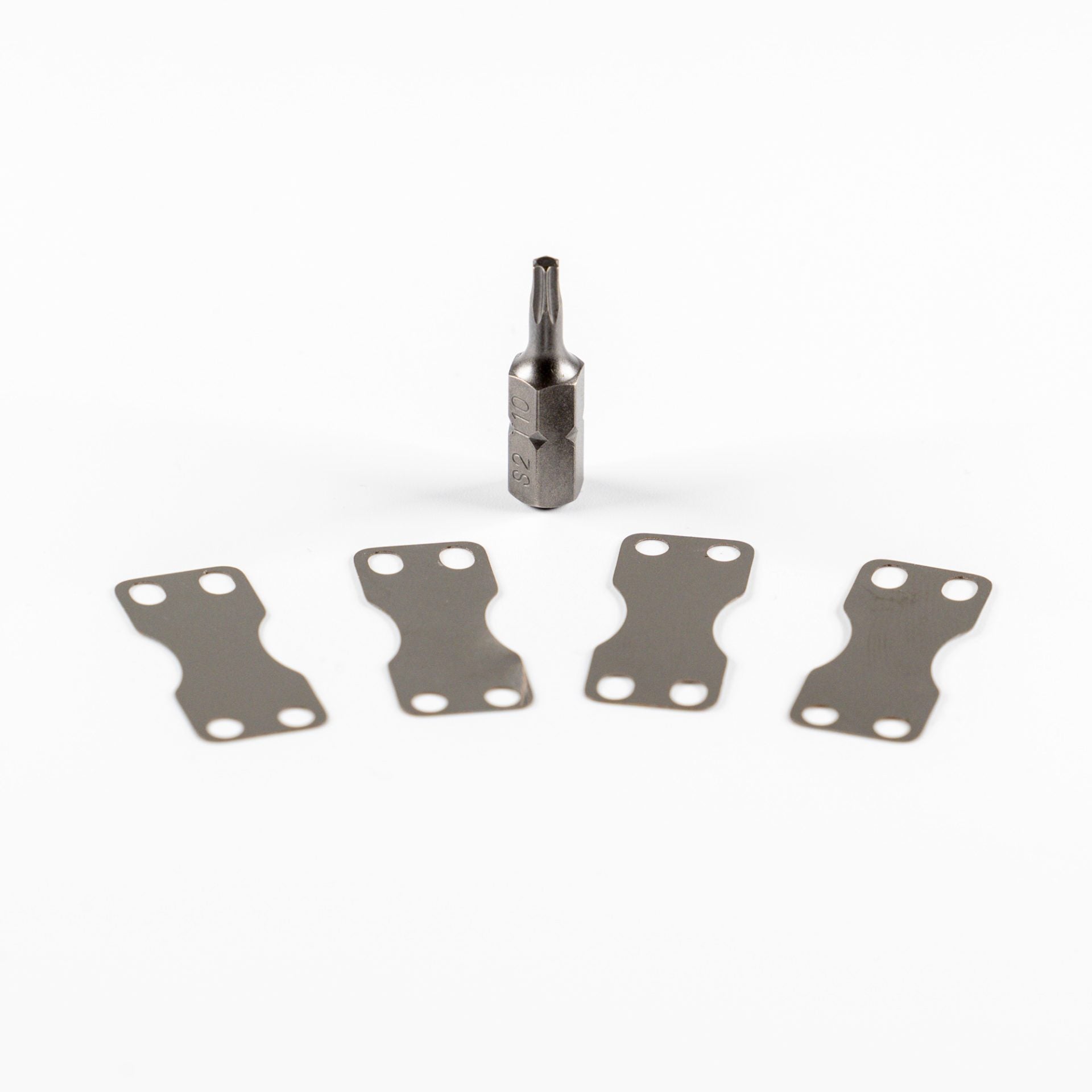 4-pack utbytbara stålfjädrar för att fästa den öppningsbara armen i stigbygeln. Två olika skruvar fäster brickan på plats. En plastskruv fäster i den yttre armen och aluminumskruvar i fotplattan. Passande torks ingår i kitet.