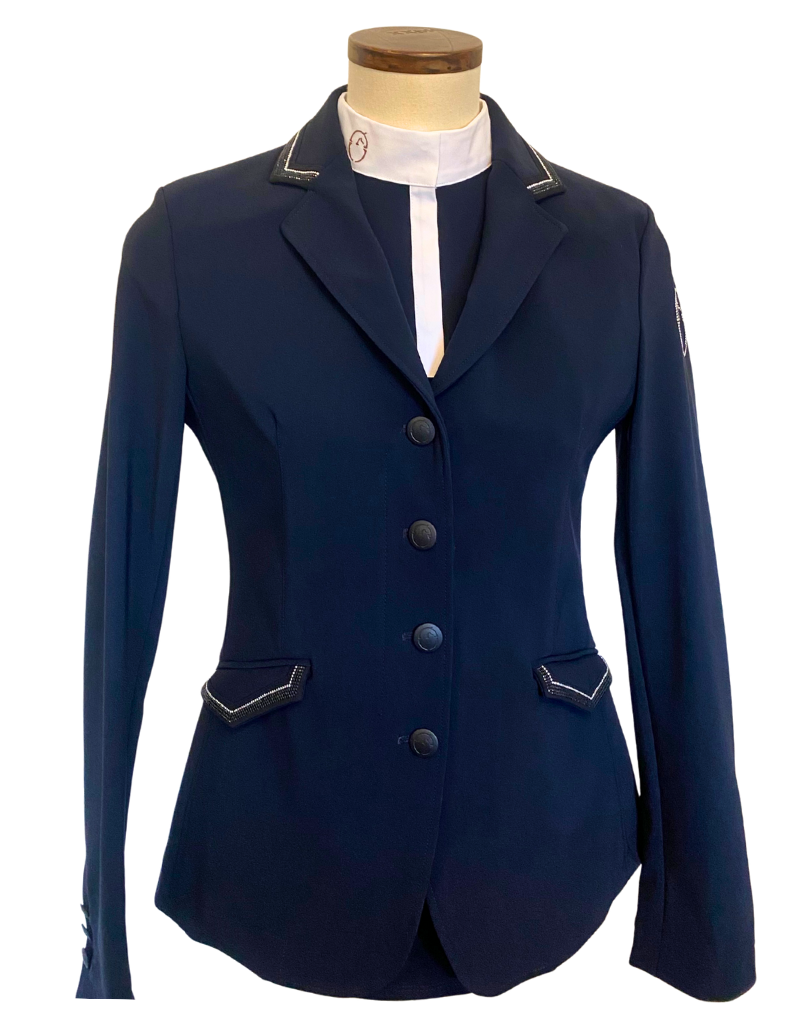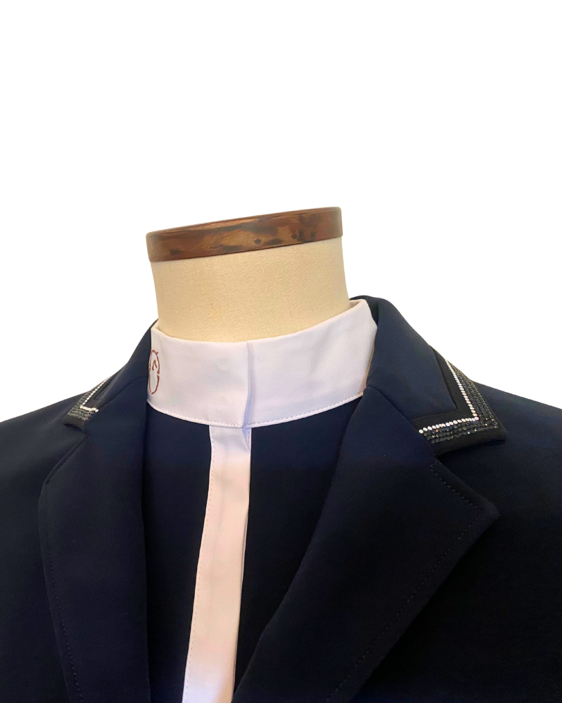 Exklusiv tävlingskavaj från italienska Vestrum! Kavajen har en klassisk feminin passform med tjusiga strassdetaljer som ger det där lilla extra. Fickorna samt kragen har svart kantband och avslutas med strass i svart och silver. Vestrums logo på ärmen är också den i silvrig strass. Snyggt och piffigt mot en mörkt marinblå botten!